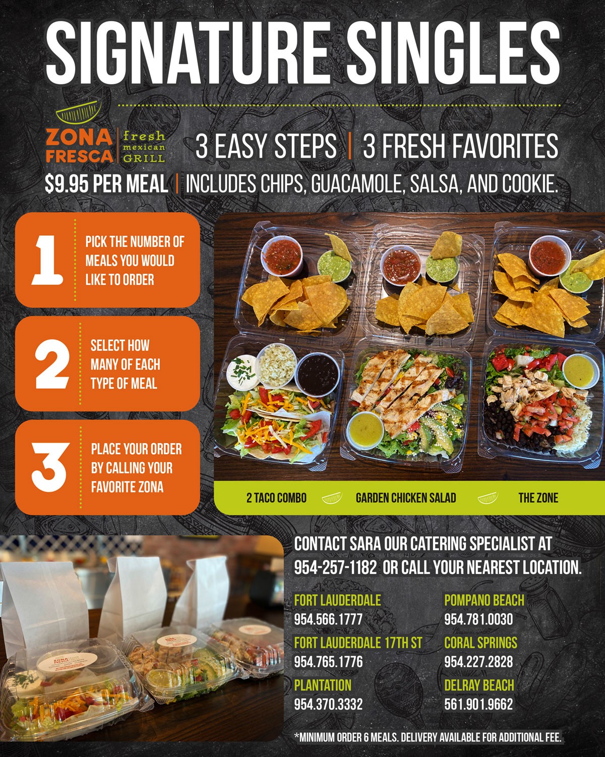 Contact Sara, our catering specialist at 954-257-1182 or call your nearest Zona Fresca location.